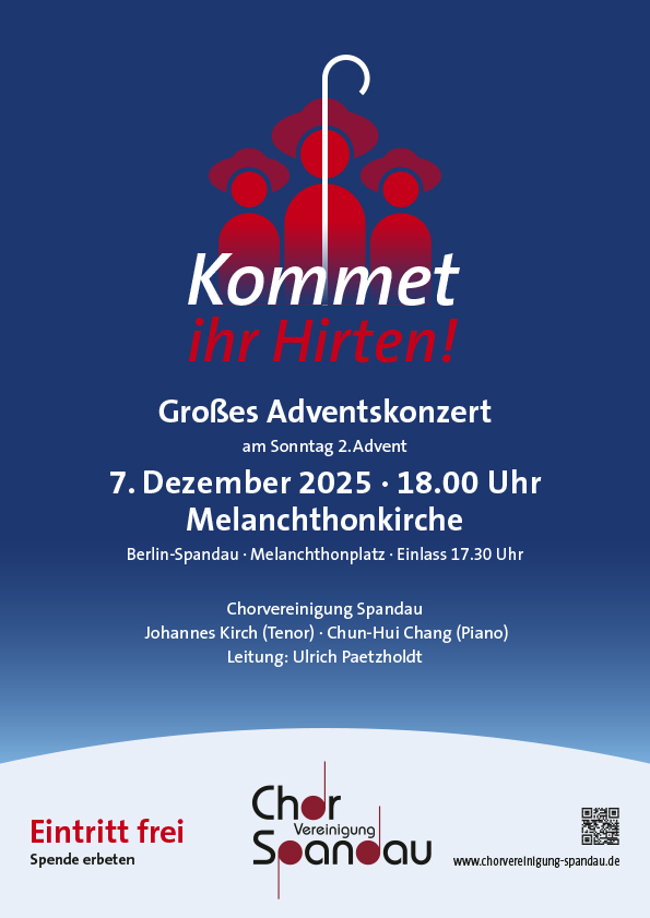 Die Chorvereinigung Spandau freut sich sehr, ihrem Publikum wieder die Wiederholung unseres traditionellen Adventskonzerts vom 1. Advent (Nikolaikirche) am 2. Advent in der Spandauer Melanchthonkirche präsentieren zu können!